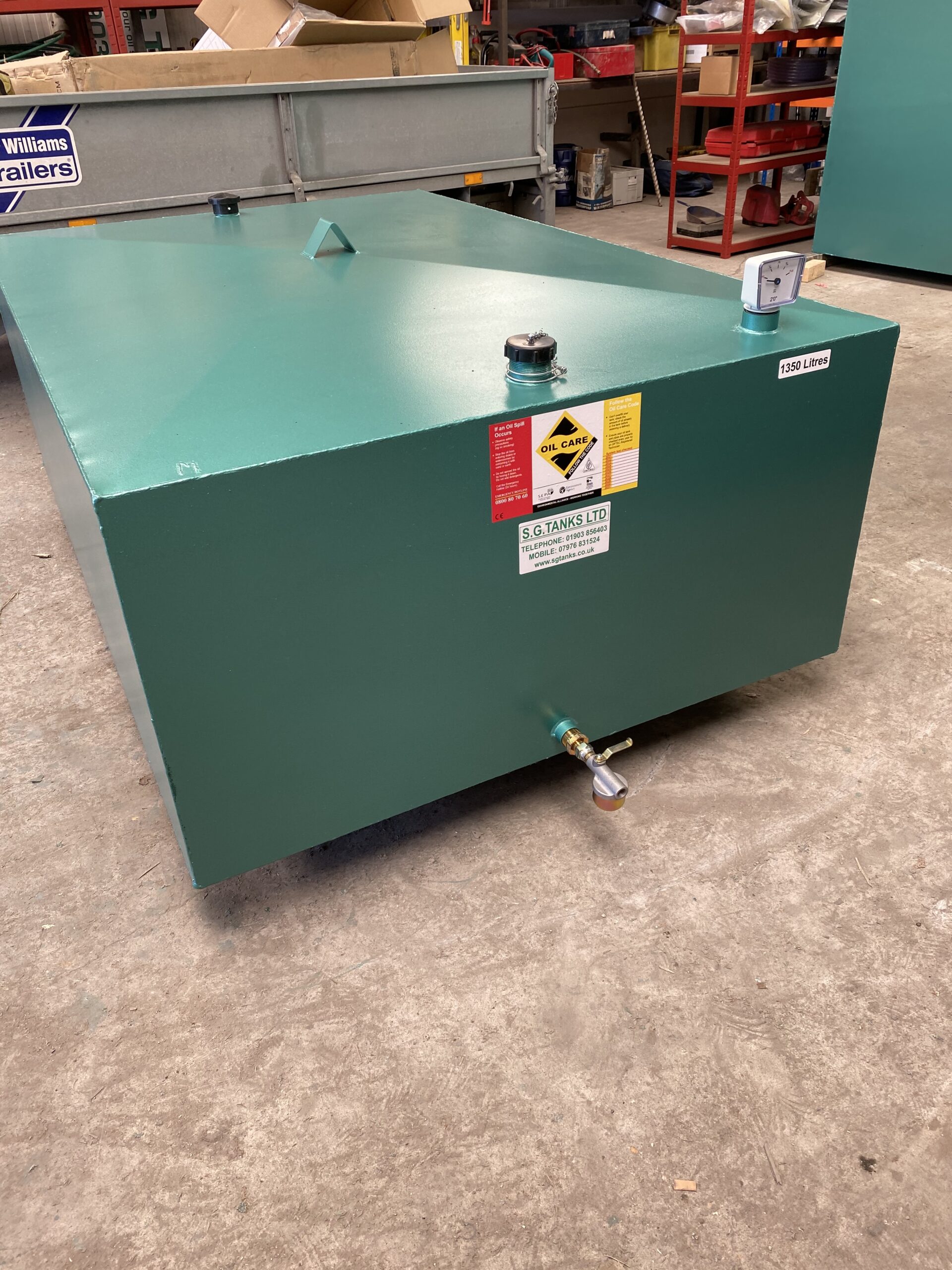 HI THIS IS A 1250tr /300gl HEATING OIL TANK MADE FROM 2.5mm MILD STEEL TANK COMES WITH 2 off 2 inch top sockets for fill and vent caps 1off 1 1/2 socket for dial gauge 1 INCH SOCKET ON BOTTOM FOR OIL FEED . SIZE IS 1830mm LONG x 600mm HIGH x 1220mm WIDE ALL TANKS COME WITH 1 UNDER COAT AND FINNISHED IN GREEN HAMMERITE TOP COAT FOR LONG LIFE TEN YEAR GUARANTEED Ask if you need different size/capacity/spec Always in stock we are the manufacturer S G Tanks are based in West Sussex Double skinned Bunded tanks are also made by us, EMAIL salessgtanks.gmail.com WWW.SGTANKS.CO.UK WE CAN INSTALL TANK PUMP OUT OLD TANK AND TAKE AWAY ,GET FREE OIL TANK QUOTATION FROM A OFTEC TECHNICIAN PLEASE RING SEAN FOR MORE INFO ON 01903 856403 WWW.SGTANKS.CO.UK Tank comes complete with fuel gauge caps and filter.